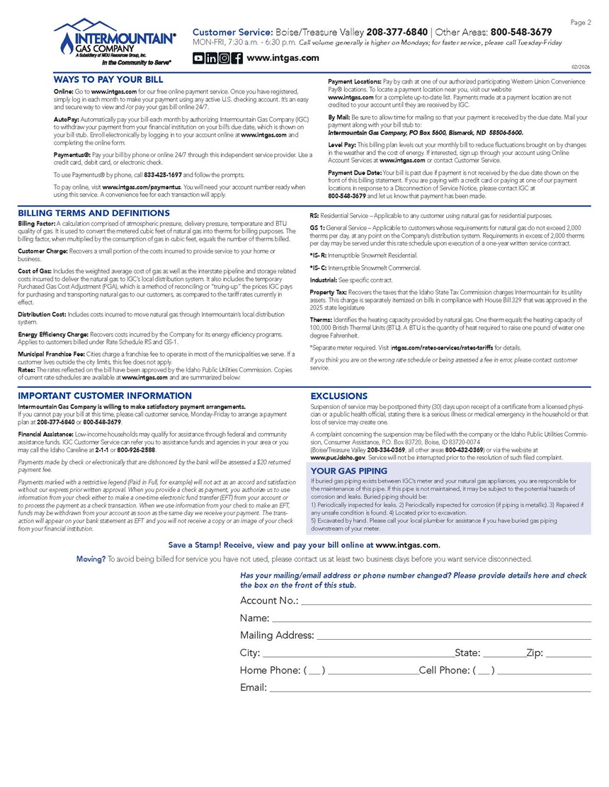 Return this portion of the bill to Intermountain Gas Company with your payment. When mailing your payment, please make sure the address on the remittance stub shows through the window on the return envelope.